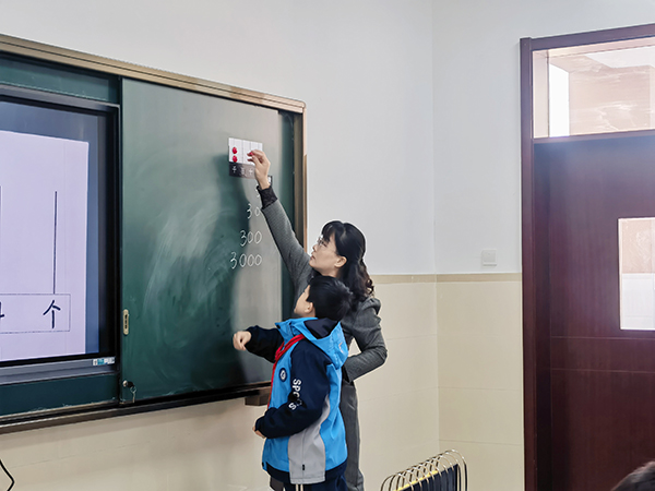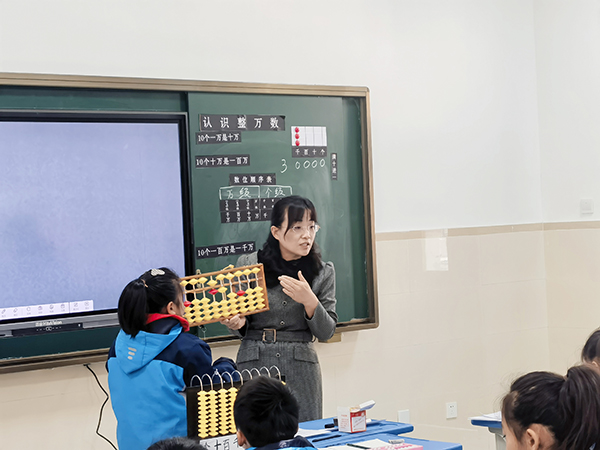 王老師為我們帶來一節(jié)別樣的數(shù)學(xué)課——《認識整萬數(shù)》。王老師先是以撥數(shù)游戲開始,從3、30、300、3000這個過程,喚醒學(xué)生對計數(shù)器、計數(shù)單位、數(shù)位的記憶。緊接著王老師出示“30000”這個數(shù),并要求在自己的計數(shù)器撥數(shù),引起了學(xué)生的質(zhì)疑。一句追問“30000在自己的計數(shù)器無法表示,怎么辦?”引起了學(xué)生的深思,發(fā)現(xiàn)原有的數(shù)位已經(jīng)無法滿足所需,通過合作學(xué)習(xí),學(xué)生創(chuàng)造出一個新的計數(shù)器。這里不僅是簡單的解決一個數(shù)學(xué)問題,而是讓學(xué)生的認知有了一次“有意味”的拓展。