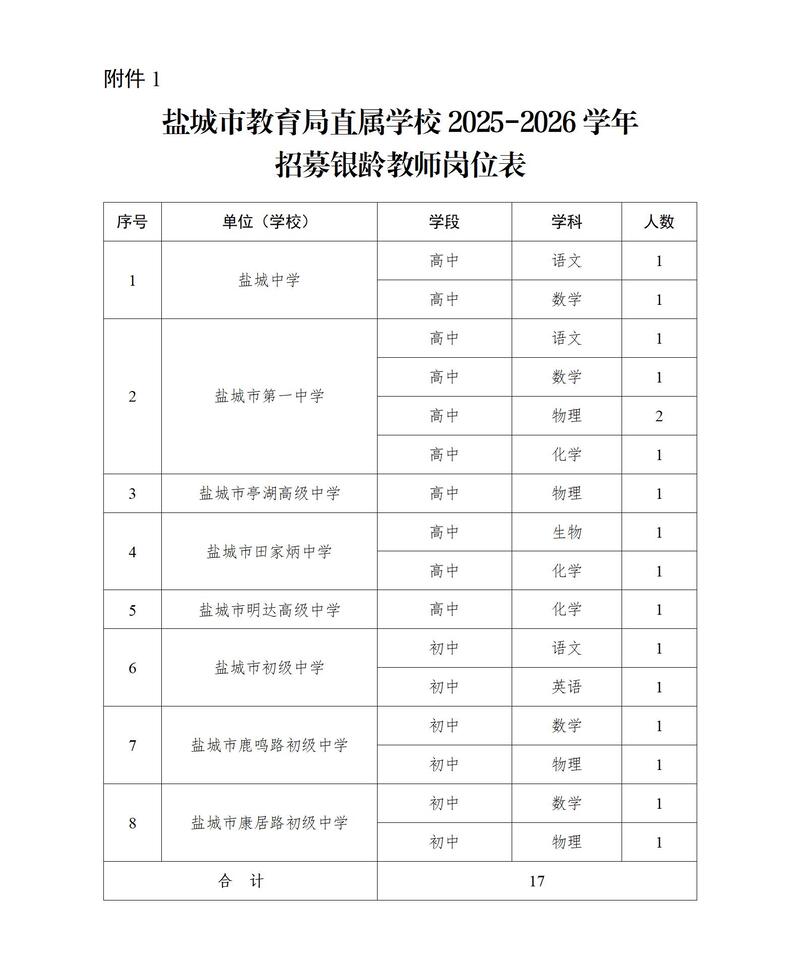 鹽城市2025年計劃招募銀齡教師17名,面向市內外公開招募初高中優(yōu)秀退休教師。原則上返聘年齡不超過65周歲,退休教師須具有高級教師以上職稱,且教學業(yè)績突出、同行認可度高。崗位職責主要從事學校課堂教學工作,原則上要求滿工作量。同時,承擔指導、培育中青年骨干教師責任。