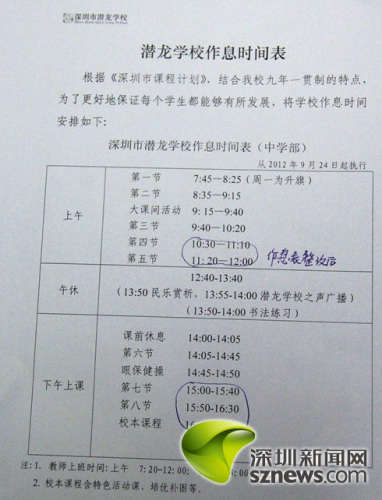 記者了解到,目前,潛龍學(xué)校已作出整改措施,調(diào)整了作息時(shí)間,并發(fā)出了取消補(bǔ)課的通知。在黃校長(zhǎng)提供的一份潛龍學(xué)校作息時(shí)間表上記者發(fā)現(xiàn),自2012年9月24日起,以前課間只有5分鐘休息時(shí)間的兩個(gè)時(shí)段已被改為10分鐘。