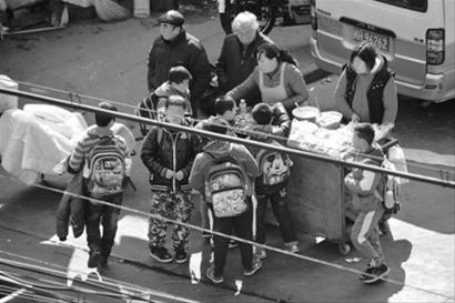 □放學(xué)后,不少學(xué)生圍在蒙古路上一個(gè)小攤販周圍。