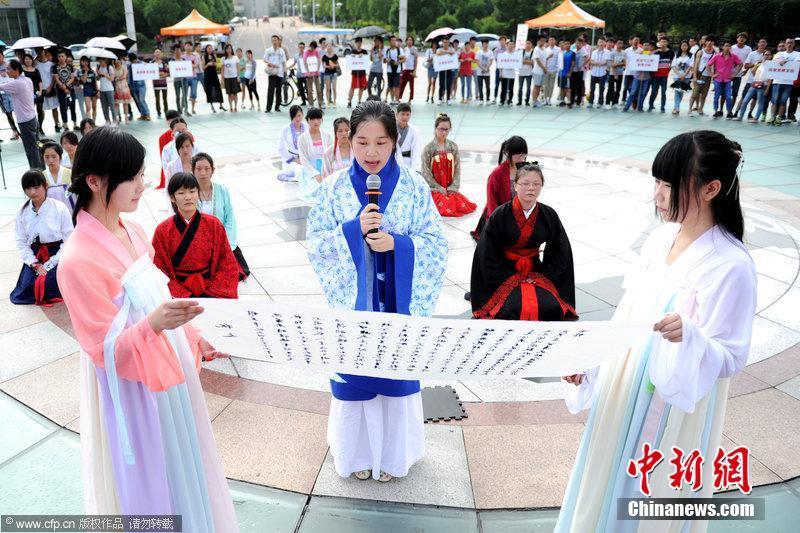 5月22日,武漢,湖北經(jīng)濟(jì)學(xué)院端午文化節(jié)暨首屆龍舟大賽啟動(dòng)儀式上,該校漢滄浪漢服社的30多名同學(xué)們身著漢服,雙手作揖,焚香撫琴,以傳統(tǒng)方式將“古代祭祀”的過程一一展現(xiàn)給師生,用儒家最繁縟的禮儀祭祀屈原,吸引眾多師生駐足觀看。楊宏斌 攝 圖片來源:CFP視覺中國(guó)
