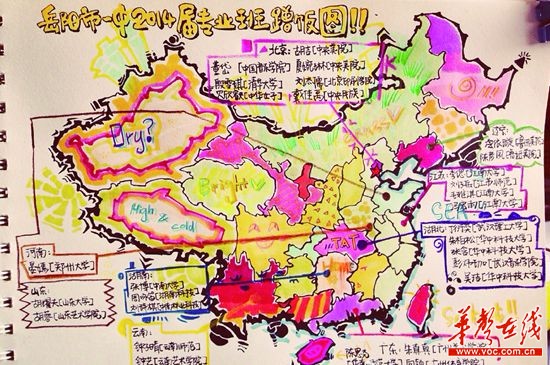 高考后,班里同學(xué)的錄取通知書紛紛到手,她就畫出了這樣一張“蹭飯圖”。這張地圖上標(biāo)明了班里30多名同學(xué)的去向,每個省有哪些同學(xué),在哪座城市,哪所大學(xué),圖上都清清楚楚地標(biāo)示出來。