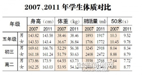 記者從市教育局體衛(wèi)藝術(shù)處查閱到,從2007至2011年,哈市最新的學(xué)生體質(zhì)健康監(jiān)測數(shù)據(jù),發(fā)現(xiàn)5年來,中小學(xué)生們的身高、體重、肺活量、耐力等體質(zhì)、體能數(shù)據(jù)無巨大變化,有的數(shù)據(jù)不升反降。