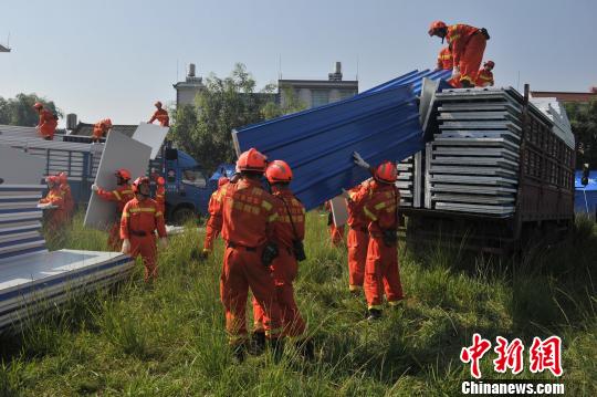 圖為消防官兵正在對運抵的板房材料進(jìn)行卸貨 任東 攝