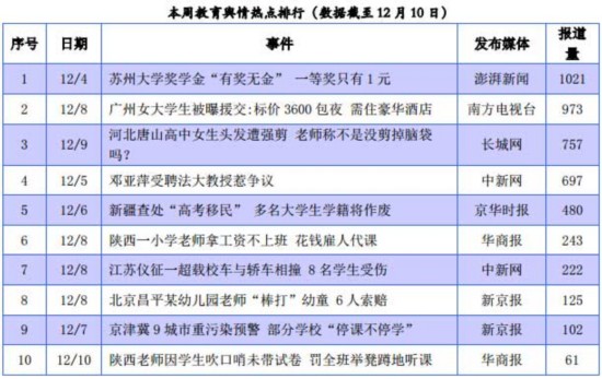從媒體轉(zhuǎn)載量來(lái)看,蘇州大學(xué)獎(jiǎng)學(xué)金“有獎(jiǎng)無(wú)金” 一等獎(jiǎng)只有1元、廣州女大學(xué)生被曝援交:標(biāo)價(jià)3600包夜 需住豪華酒店、河北唐山高中女生頭發(fā)遭強(qiáng)剪 老師稱(chēng)不是沒(méi)剪掉腦袋嗎?、鄧亞萍受聘法大教授惹爭(zhēng)議、新疆查處“高考移民” 多名大學(xué)生學(xué)籍將作廢、陜西一小學(xué)老師拿工資不上班 花錢(qián)雇人代課、江蘇儀征一超載校車(chē)與轎車(chē)相撞 8名學(xué)生受傷、北京昌平某幼兒園老師“棒打”幼童 6人索賠、京津冀9城市重污染預(yù)警 部分學(xué)校“停課不停學(xué)”、老師因?qū)W生吹口哨未帶試卷 罰全班舉凳蹲地聽(tīng)課為媒體曝光率最高的10個(gè)教育新聞。