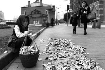 1月12日,行人從“賣火柴的小女孩”前經(jīng)過。當(dāng)日,由公益機(jī)構(gòu)“愛心衣櫥”發(fā)起的行為藝術(shù)“賣火柴的小女孩”公益活動(dòng)在上海外灘街頭上演,旨在喚起社會(huì)關(guān)注嚴(yán)寒天氣中的山區(qū)兒童,把更多的溫暖傳遞給他們。 新華社發(fā)