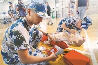 21日,南師附中高一軍訓(xùn)新生舉行“紅十字救護(hù)培訓(xùn)與國(guó)防教育結(jié)合”現(xiàn)場(chǎng)演練。從2014年起,南京部分高中暑假軍訓(xùn)面向高一新生開(kāi)展救護(hù)知識(shí)的普及培訓(xùn),今年試點(diǎn)學(xué)校增至28所,受訓(xùn)學(xué)生4萬(wàn)多人。(劉莉)