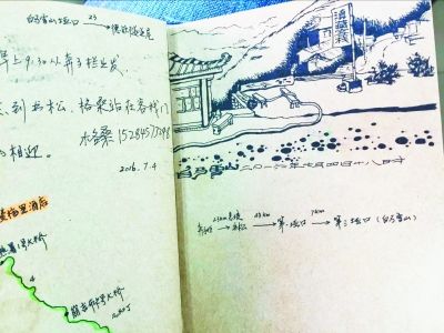 “光翻越白馬雪山就用了兩天時間,那天早上6點半出發(fā),下午4點多到埡口,中間40公里,騎了10個小時。”王傳生說,下山的時候不用踩腳踏,速度很快,看著路邊的美景,他心潮澎湃,激動地哭了,這是他騎行中難以忘懷的一天。木桌椅、小屋子、層層疊疊的山巒……他將當(dāng)天留宿的滇藏客棧繪制在了手冊上,并注明地點和時間。目前,他的手繪地圖已有3本,經(jīng)常給一些朋友和網(wǎng)友做線路和攻略,希望借此手繪地圖讓大伙兒細(xì)致地了解這些地方。
