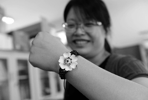 昨天,現(xiàn)代快報記者看到了王老師珍藏的這條手鏈。深藍色絲線打成一個個平結(jié),接口處則換成了好看的八字結(jié);這些漂亮的花結(jié)簇擁著一朵陶瓷蓮花,花瓣的尖端有著一點點靛藍,看上去十分嬌俏。