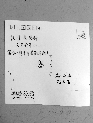一開始,劉蓓蓓以為這只是一副單純的圖畫,沒想到發(fā)到朋友圈之后,才發(fā)現(xiàn)孩子的用心。“這幅畫的背面有孩子寫的祝福語,上面填郵編的地方,孩子寫的是211314,諧音愛你一生一世。當時有人評論說是這樣一個意思,我非常驚訝。”劉蓓蓓說,“因為高中學業(yè)繁忙,她涂這幅畫只能利用社團活動的時間,一周一次,前后花了一個多月時間吧。孩子這么有心,讓我覺得當老師是非常幸福的事。”