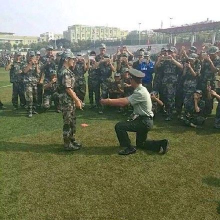 從曝光的照片來看,表白的教官不止一人,有的教官單膝跪地向女生表白,有的手捧鮮花表白,也有摟住女生的肩部在校園走動,更有甚者當眾親吻女生的臉。