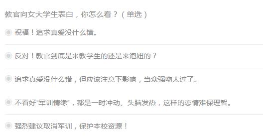 “教官表白事件”先是在學校貼吧引起熱烈討論,隨后照片傳到微博上,引起不小的關(guān)注。新浪微博話題#軍訓教官向女生表白#超過1700萬閱讀,網(wǎng)絡(luò)調(diào)查更是吸引眾多網(wǎng)友投票關(guān)注,評論不一。