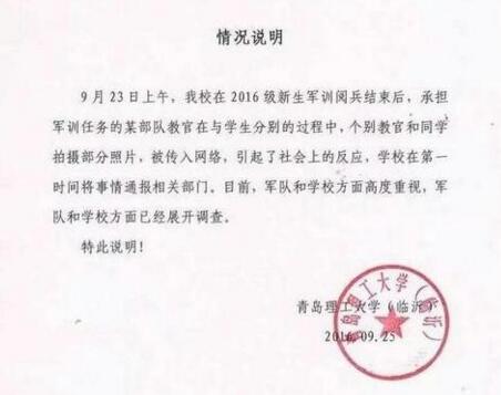 9月25日,校方發(fā)出一份情況說明稱,軍隊和學校方面對此高度重視,軍隊和學校方面已經(jīng)展開調(diào)查。