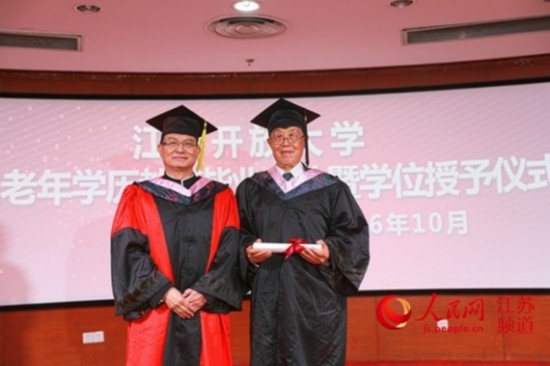 江蘇開(kāi)放大學(xué)校長(zhǎng)崔新有(左)為首屆老年大學(xué)生張煥國(guó)頒發(fā)學(xué)士學(xué)位證書(shū)。