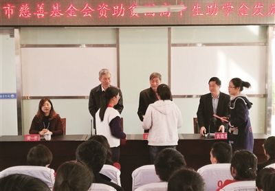 11月2日,市慈善基金會在市第一中學(xué)舉行貧困高中生助學(xué)金發(fā)放儀式,向全市104位貧困高中生發(fā)放每人2000元的助學(xué)金,幫助他們解決學(xué)習(xí)、生活上的燃眉之急。圖為第一中學(xué)貧困學(xué)生領(lǐng)取助學(xué)金現(xiàn)場。張建平 郁蘭春 攝