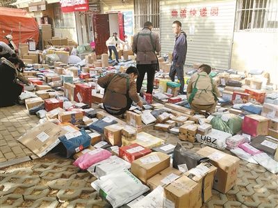 15日上午,一輛面包車(chē)開(kāi)進(jìn)了中國(guó)礦業(yè)大學(xué)南湖校區(qū),徑直往學(xué)生生活區(qū)開(kāi)去。這輛面包車(chē)看似普通,里面卻裝滿(mǎn)了從分揀中心送過(guò)來(lái)的上百個(gè)包裹。跟隨該車(chē),記者來(lái)到礦大物流園外,“三通一達(dá)”、順豐和EMS都在現(xiàn)場(chǎng)設(shè)置了取件點(diǎn),快遞包裹源源不斷地送到,工作人員分揀后堆積成一座座小山……