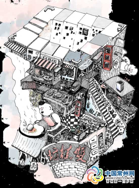 就拿紅梅老街來說,常州人都知道當(dāng)?shù)氐闹放萍t梅牛奶,他就畫了一個牛奶盒子來表現(xiàn)街道風(fēng)貌;熱鬧的雙桂坊,已經(jīng)有1000多年的歷史,是地方美食文化代表地,廚師的形象是最好的“代言”;插畫“八角井”上,右上方有一處細節(jié),是一行字“百年老街買菜不用帶現(xiàn)鈔”,這是王澤文與同學(xué)交流時獲得的靈感。