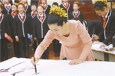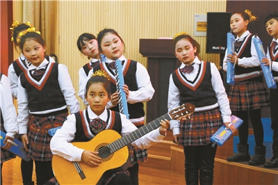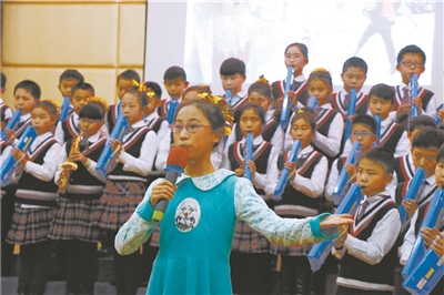 媽媽說中國有一句話,爸爸說自己是聽著它長大的……”咦?是哪兒傳來的聲音?嘿,原來是五(6)班在演奏《學習歌》。
