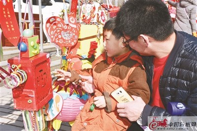 6歲的趙一菲小朋友和家長,巧妙地將舊雞毛撣子的毛摘下來,精心粘在一只硬紙板做成的大公雞身上,再用紅紙做成雞冠,黃紙做成雞頭,黑紙做成雞爪,點(diǎn)綴上黑色的眼睛,一只神氣活現(xiàn)的雞形花燈形象逼真,妙趣橫生。