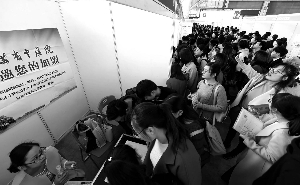 這場大會是一年一度全省最大規(guī)模的“名醫(yī)名院”集中展示。小醫(yī)院鉚足了勁,想法設(shè)法“秀”優(yōu)勢,大醫(yī)院則繼續(xù)保持低調(diào)。現(xiàn)代快報記者注意到,南京鼓樓醫(yī)院、南京兒童醫(yī)院等都“藏”在角落里。沒有醒目的海報,也沒有清楚的崗位、薪酬介紹,不過,求職者們?nèi)詫⒄刮粩D得水泄不通。