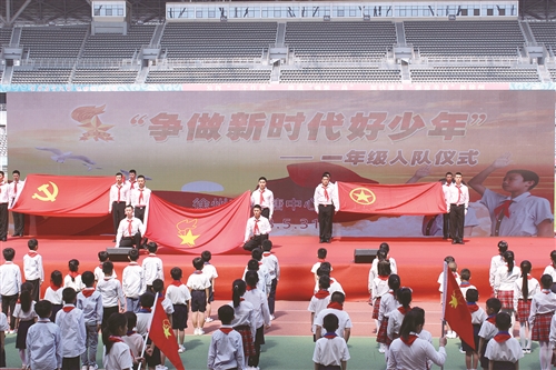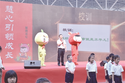 ◎本報(bào)全媒體記者 劉蘇 5月31日上午,陽(yáng)光普照,照在了徐州奧體中心,照在了潘塘中心小學(xué)數(shù)千名學(xué)生的笑臉上。這里正在進(jìn)行的是《慧心引領(lǐng)成長(zhǎng) 樂創(chuàng)點(diǎn)亮未來——徐州市潘塘中心小學(xué)2018慶六一文藝匯演暨一年級(jí)入隊(duì)儀式》,活動(dòng)設(shè)置了少先隊(duì)員入隊(duì)儀式、文藝演出和“慧創(chuàng)”教育理念發(fā)布會(huì)三個(gè)環(huán)節(jié),學(xué)校全體師生、家長(zhǎng)代表,以及徐州市體育局領(lǐng)導(dǎo)、云龍區(qū)政府和教體局領(lǐng)導(dǎo),以及書法協(xié)會(huì)民進(jìn)黨人士參加。 入隊(duì)儀式、文藝誦讀點(diǎn)燃奧體中心 雖說徐州奧體中心是家門口的大型場(chǎng)所,但是大多數(shù)學(xué)生仍沒有到過這里。面對(duì)壯觀的奧體,尤其是走進(jìn)偌大的足球場(chǎng),同學(xué)們興奮地“哇哇”贊嘆著,小腦袋不停地?fù)u來晃去左看右看。 “這里好大!”“太漂亮了!”“我們能在這里踢球就好了!”……一些來過奧體的同學(xué)不無自豪地說:“我來過這里游泳,去年我爸爸帶我來的。這里的室外游泳池里還有滑梯呢!可好玩了!” 對(duì)場(chǎng)地的新奇過去后,孩子們開始把關(guān)注點(diǎn)轉(zhuǎn)移到了場(chǎng)地四周擺放的書畫作品上,這些都是學(xué)校的同學(xué)們創(chuàng)作的書畫作品,有書法,有水彩、有水墨、有油畫、有黏土畫,每一件進(jìn)入到這場(chǎng)慶六一“童心飛揚(yáng)”書畫展的作品都可圈可點(diǎn)。大人看了都不禁驚嘆:“潘塘中心小學(xué)的孩子的想象力、創(chuàng)造力真是不得了。” 早上9:30,迎著火紅的隊(duì)旗,伴著嘹亮的隊(duì)歌聲——我們是共產(chǎn)主義接班人,繼承革命先輩的光榮傳統(tǒng),愛祖國(guó),愛人民……這場(chǎng)活動(dòng)中最重要的一環(huán)——潘塘中心小學(xué)一年級(jí)入隊(duì)儀式正式開始。 首先,潘塘中心小學(xué)辛躍武校長(zhǎng)宣讀關(guān)于一年級(jí)建隊(duì)和批準(zhǔn)新隊(duì)員入隊(duì)的決定。經(jīng)過班級(jí)申請(qǐng),潘塘中心小學(xué)少先大隊(duì)特批準(zhǔn)成立了13個(gè)中隊(duì),全校共585名孩子光榮地加入了中國(guó)少年先鋒隊(duì)。當(dāng)老隊(duì)員為新隊(duì)員戴上紅領(lǐng)巾的那一刻,孩子們臉上洋溢著甜美的微笑。在大隊(duì)長(zhǎng)的帶領(lǐng)下,新隊(duì)員們?cè)陉?duì)旗下響亮宣誓:“我熱愛中國(guó)共產(chǎn)黨,熱愛祖國(guó),熱愛人民,好好學(xué)習(xí),好好鍛煉,準(zhǔn)備著:為共產(chǎn)主義事業(yè)貢獻(xiàn)力量!” 接著,新隊(duì)員代表、老隊(duì)員代表分別作了講話,他們表示:佩戴上鮮紅的紅領(lǐng)巾,他們將銘刻隊(duì)訓(xùn),遵循隊(duì)章,時(shí)刻準(zhǔn)備著,為共產(chǎn)主義事業(yè)而奮斗。 辛躍武校長(zhǎng)表示,通過這次活動(dòng),我們深信,隊(duì)員們胸前的紅領(lǐng)巾一定能激勵(lì)他們?nèi)〉靡粋(gè)又一個(gè)進(jìn)步,他們也會(huì)用自己的實(shí)際行動(dòng),證明自己無愧于“少先隊(duì)員”這個(gè)神圣的稱號(hào)。在紅領(lǐng)巾這塊陣地上,他們定會(huì)精彩自己,感動(dòng)他人,亮麗校園! 隨后,潘塘中心小學(xué)向全體學(xué)生致以節(jié)日的祝賀,向辛勤付出的教師們表示慰問和感謝。伴隨著一首《少年!少年!》舞曲,文藝誦讀展演正式拉開帷幕,奧體中心也隨之變成了一片歡騰的海洋。一年級(jí)的《三字經(jīng)》、二年級(jí)的《笠翁對(duì)韻》、三年級(jí)的《唐詩(shī)吟唱》、四年級(jí)的《游子吟》《弟子規(guī)》,五年級(jí)的《少年中國(guó)說》,六年級(jí)的《將進(jìn)酒》,還有合唱《讀唐詩(shī)》《龍文》……這些節(jié)目充分體現(xiàn)了潘塘中心小學(xué)的閱讀特色。 “慧創(chuàng)”理念辦出家門口的好學(xué)校 這次活動(dòng),從策劃到布展全體教職工都付出了很大的心血。在入隊(duì)儀式后,還播放了用老師們平時(shí)積累的素材制作而成的一年級(jí)學(xué)生成長(zhǎng)記錄片,這樣的小細(xì)節(jié)讓在場(chǎng)的家長(zhǎng)和孩子都非常感動(dòng)。他們?yōu)楹⒆佑羞@么認(rèn)真負(fù)責(zé)的老師感到欣慰,更為在偏離城市中心的家門口就有這樣的好學(xué)校感到高興。 潘塘中心小學(xué),去年起隸屬于徐師一附小教育集團(tuán)。2014年9月云龍區(qū)成立了5個(gè)教育集團(tuán),打造集團(tuán)化辦學(xué)。所謂集團(tuán)化辦學(xué),就是將一所名校和若干所學(xué)校組成學(xué)校共同體(名校集團(tuán)),以名校為龍頭,在教育理念、學(xué)校管理、教育科研、教育評(píng)價(jià)等方面統(tǒng)一管理,實(shí)現(xiàn)優(yōu)質(zhì)教育資源共享。 “集團(tuán)化辦學(xué)不是簡(jiǎn)單地加一塊招牌,要幫助一所學(xué)校實(shí)現(xiàn)‘新生’,需要總校原有先進(jìn)管理理念、文化的移植和再生長(zhǎng),必須付出艱苦的努力。”潘塘中心小學(xué)校長(zhǎng)辛躍武說,“集團(tuán)分校要經(jīng)歷從模仿、生長(zhǎng)、融合,最后到創(chuàng)生的過程。”潘塘中學(xué)小學(xué)不是對(duì)徐師一附小品牌的簡(jiǎn)單復(fù)制,而是在吸納總校優(yōu)秀教育文化的基礎(chǔ)上開出更絢麗的花朵。 在當(dāng)天的活動(dòng)上,學(xué)校還進(jìn)行了“慧創(chuàng)”教育理