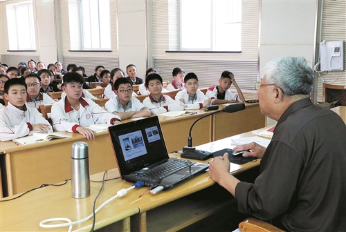 圖為周廣華在校園講民謠。同學(xué)們邊聽、邊看、邊念、邊提問,高興地說,聽周爺爺講課真過癮!