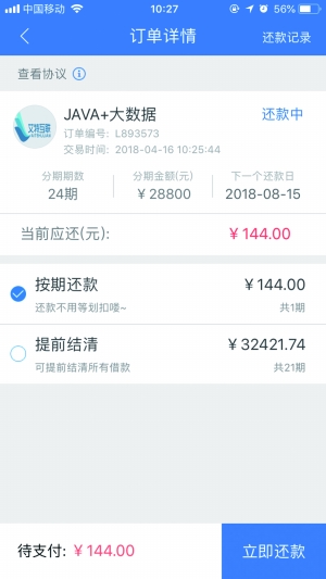 小陸打開手機(jī)給記者看,分期訂單項目名為“JAVA+大數(shù)據(jù)”,當(dāng)時他們還有些納悶,怎么項目課程和電腦編程有關(guān)?不過人事肯定地說,他們學(xué)的課程就是SAP系統(tǒng)。于是,小陸簽訂了協(xié)議。在“蠟筆分期”中,分期金額為28800元,還款期數(shù)為24個月,年利率為10%, 還款總額為35717.7元。