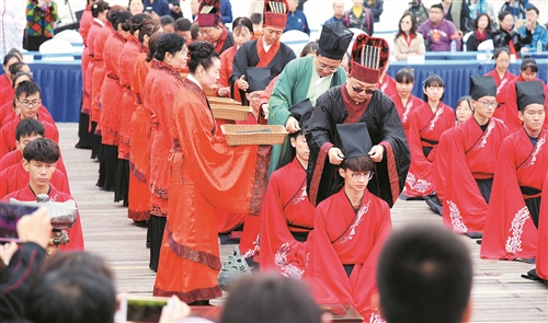 欣賞完漢服展示和精彩的詩書禮樂表演后,百余名青年學(xué)子列隊(duì)穿過成人之門,加笄加冠儀式正式開始,最后拜四方禮,集體感受成長的責(zé)任和榮耀。