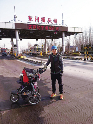 讓蔡龍沒有料到的是,童車竟然扎帶了。“因為過年,一路上找不到修車鋪,我也不會補(bǔ)胎。好在帶了打氣筒,就只好平均每隔半小時左右停下來充氣。”蔡龍說,即使童車這樣不省心,他也不能扔了,因為童車要載著他路上的補(bǔ)給。