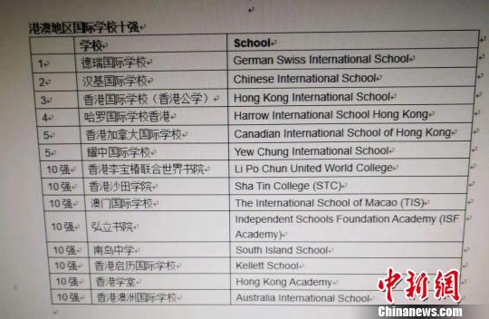位列“港澳地區(qū)國際學校十強”榜單前五名的有德瑞國際學校、漢基國際學校、香港國際學校(香港公學)、哈羅國際學校香港、香港加拿大國際學校、耀中國際學校(并列第五)。
