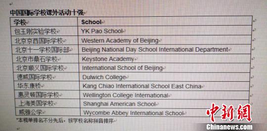 在“中國國際學校課外活動十強”榜單中,上榜的有包玉剛實驗學校、北京京西國際學校、北京十一學校國際部、北京市鼎石學校、北京順義國際學校、德威國際學校、華東康橋康、惠靈頓國際學校、上海美國學校、威雅公學。(排名不分先后,按學校名稱拼音排序)。