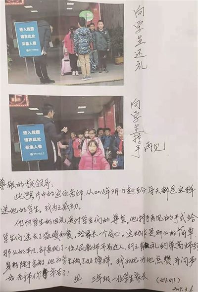 被家長拍照記錄、特地寫來感謝信的這位老師是南京市五老村小學(xué)的成龍軍老師,去年9月剛剛工作,這是青春帥氣的他正式走上工作崗位的第二個學(xué)期。“特別勤奮和優(yōu)秀,實習(xí)的時候就在我們學(xué)校,憑借出色的業(yè)務(wù)能力后來又考進了我們學(xué)校,成為年輕的骨干力量。”五老村小學(xué)副校長駱寧告訴記者,成龍軍老師是三年級班主任和語文老師,雖然工作年限不長,但對工作極其認真負責(zé)。“我們學(xué)校每天早晨行政人員、護導(dǎo)老師、志愿者都會在門口向每一個孩子問好,放學(xué)的時候班主任老師送隊到門口,和孩子們道再見。”駱副校長說,每個老師都會在學(xué)校規(guī)范的基礎(chǔ)上融進自己的教育理念,成龍軍老師就形成了自己的“特色送班禮儀”,每天孩子們向他說再見后,他都要鞠躬還禮,言傳身教給予孩子們好的示范,被有心的家長拍攝和記錄了下來。