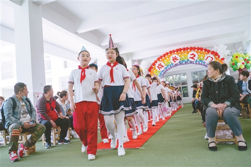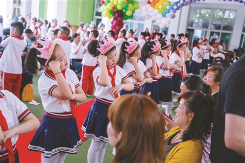 上午九點,儀式開始了。永安街小學的同學們系著紅領巾、戴著生日帽,在《陪你長大》的樂曲聲中,穿越成長之門,走到爸爸媽媽身邊偎依而坐。這時,大屏幕上出現(xiàn)了同學們小時候的照片,一張張萌萌噠的小臉不時讓老師和家長感慨歲月如梭,孩子就在不知不覺中長大。