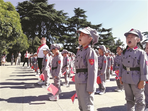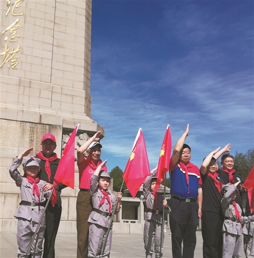 烈日炎炎,在莊嚴(yán)高聳的淮塔前,3位老人見證了369名解放路小學(xué)少先隊員的入隊儀式。
