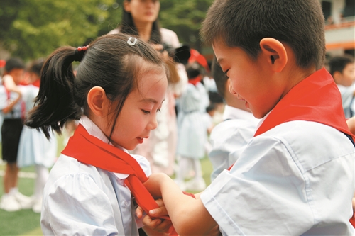 睢寧縣第三實(shí)驗(yàn)小學(xué)隆重舉行“紅領(lǐng)巾心向黨,隊(duì)旗伴我共成長(zhǎng)”一年級(jí)新隊(duì)員入隊(duì)儀式。 本報(bào)全媒體記者 曲美慧 攝