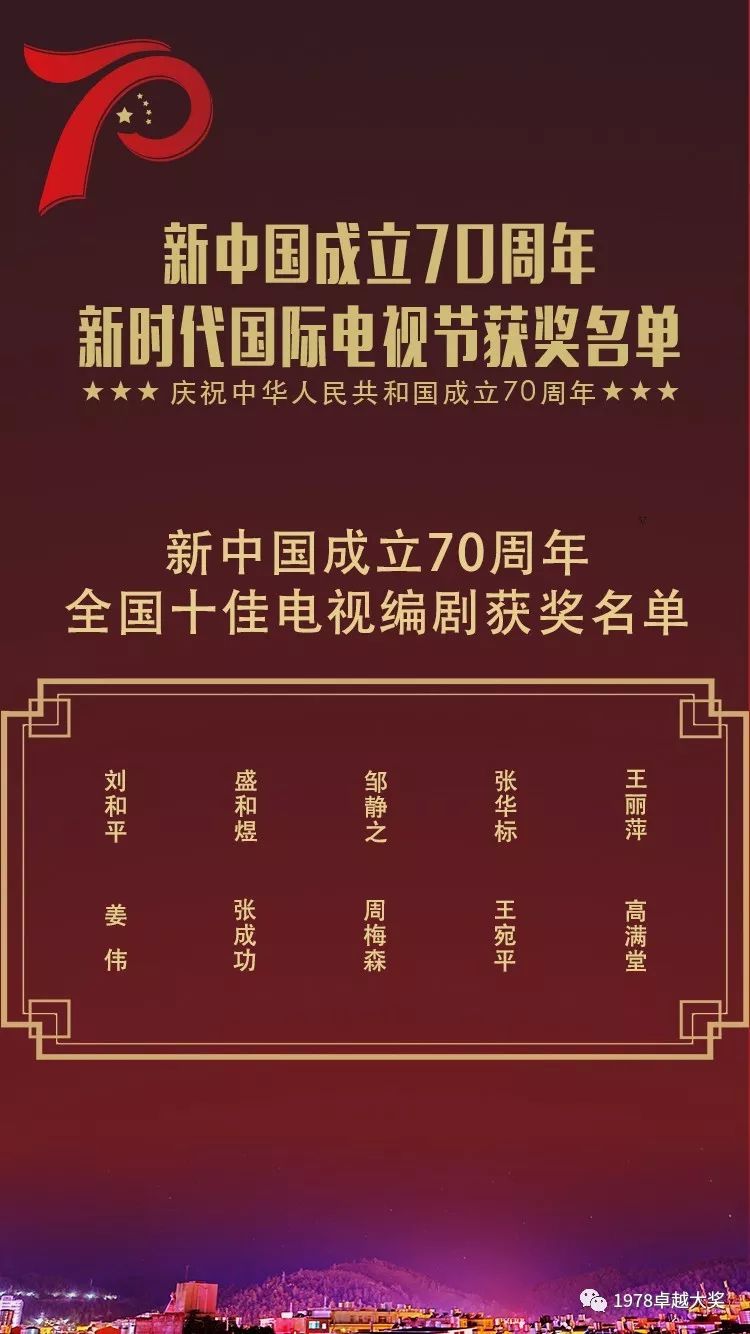 12月6日,新時代國際電視節(jié)推出的中華人民共和國成立70周年全國十佳電視編劇名單重磅出爐。此次獲獎的十佳編劇是:高滿堂、張華標、張成功、盛和煜、王麗萍、姜偉、鄒靜之、王宛平、劉和平和周梅森(排名順序不分先后)。中國電視劇創(chuàng)作上的黃金年代,孕育了一批優(yōu)秀的電視劇人。《闖關(guān)東》《刑警本色》《走向共和》《媳婦的美好時代》《不要和陌生人說話》《康熙微服私訪記》《金婚》《大明王朝1566》《人民的名義》等一部部享譽全國的優(yōu)秀作品,正是出自上面十位幕后英雄之手。