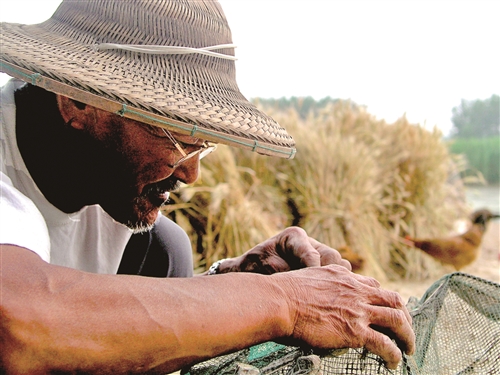 補(bǔ)網(wǎng)的老人。 邳州水上集市,
