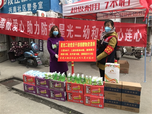 3月2日,星光二幼黨支部全體黨員干部將自發(fā)捐款購(gòu)買的防疫物資,捐贈(zèng)給在防疫一線的泉山區(qū)段莊街道興南社區(qū)工作人員,助力社區(qū)疫情防控,以實(shí)際行動(dòng)踐行初心使命。