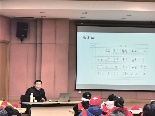 他以“春夏秋冬”四個(gè)甲骨文為例,激發(fā)學(xué)生們的興趣:“春字像春天草木初生,夏字像夏天烈日當(dāng)頭,秋字像燒荒秋蟲(chóng),冬字像結(jié)繩記事象征四時(shí)終結(jié)。分析甲骨文的形狀,可以了解到許多傳統(tǒng)文化知識(shí)。”