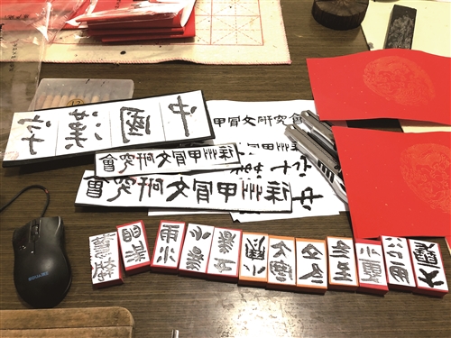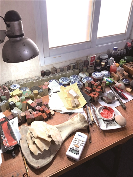 屋里的每面門、墻都貼著甲骨文、金文書法或掛著用紙板鏤空做的甲骨文字,邊邊角角還有成堆的用來(lái)刻字的木板、膠版,窗前寫字臺(tái)排著上百方的印章及刻刀、牛骨、殘磚、木塊、膠皮,雜亂中又有著某種規(guī)律。