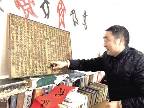 說(shuō)起與漢字的結(jié)緣,劉志賢從廚房里搬出一塊半平方米大的刻滿老宋體字的雕版,這是他7年前為自己的《釋紋解字》書稿作的序,細(xì)述了自少年以來(lái)鉆研古字的歷程。當(dāng)時(shí)寫完之后,意猶未盡,他又花了3個(gè)月時(shí)間,按照古籍書版的式樣雕刻成版。