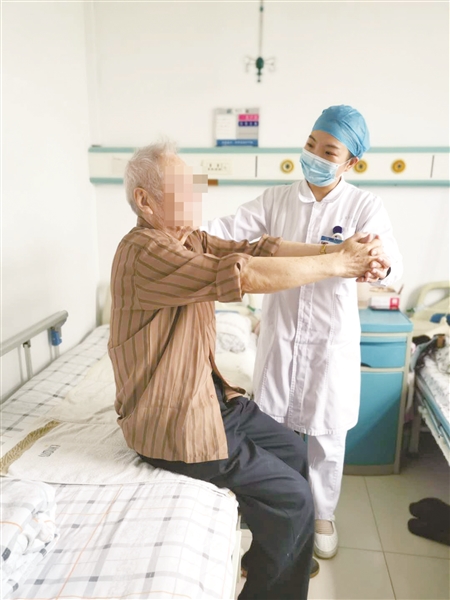 由于科室里的患者年老體弱,加上疾病導(dǎo)致的自控意識(shí)差,每天,護(hù)士們都要幫助患者料理個(gè)人衛(wèi)生,包括整理床被、洗漱,對(duì)有吞咽困難的老人,護(hù)士們還會(huì)親手喂他們吃飯、喝水。為了防止久臥的病人產(chǎn)生壓瘡,或是下肢深靜脈血栓形成,護(hù)士們需要防患于未然,經(jīng)常性開展協(xié)助翻身、拍背、教授康復(fù)操等多種護(hù)理操作。
