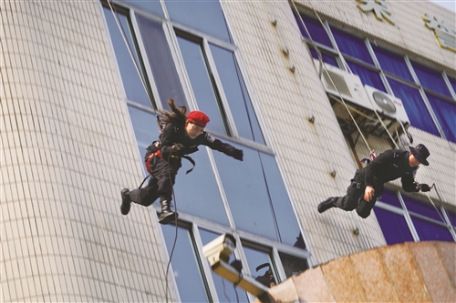 精彩的表演即將開始。在講解員姐姐繪聲繪色的講解下,兩位巡特警為我們表演了高空下墜,倒立下墜等高難度的警務(wù)技能,他們身輕如燕,動(dòng)作敏捷,真可謂是“飛檐走壁”!