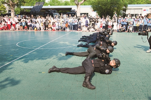 中華傳統(tǒng)武術(shù)出神入化,巡邏民警對(duì)可疑人員盤查場(chǎng)景逼真、無人機(jī)空中巡查精準(zhǔn)高效。在巡特警一大隊(duì)女隊(duì)員李曉彤聲情并茂的主持解說下,各種特戰(zhàn)技能和裝備展示應(yīng)接不暇,特戰(zhàn)隊(duì)員個(gè)個(gè)虎勁十足,師生們大飽眼福,掌聲雷鳴。活動(dòng)中,巡特警隊(duì)員們先后表演了索降攀爬、擒拿格斗術(shù)、快速射擊、翻滾超重輪胎等科目,充分展現(xiàn)了巡特警鐵軍高超的專業(yè)素養(yǎng)和良好的隊(duì)伍形象,在學(xué)生們的心中播撒了正能量的火種。觀看表演的過程中,師生們不時(shí)爆發(fā)出陣陣喝彩聲,為巡特警叔叔的精彩表現(xiàn)吶喊助威。全副武裝的巡特警隊(duì)員進(jìn)行野外搜捕戰(zhàn)術(shù)隊(duì)形表演科目,成了當(dāng)天活動(dòng)的“壓軸戲”,12名全副武裝的巡特警隊(duì)員在隊(duì)長(zhǎng)的帶領(lǐng)下,進(jìn)行著各種隊(duì)形變幻莫測(cè)的演練。后空翻、側(cè)轉(zhuǎn)身臥倒、旋轉(zhuǎn)持槍等連續(xù)高難度動(dòng)作,讓師生們贊嘆不已。