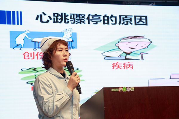 通過生動的講解和演示,房莉介紹了心臟驟停的識別,以及心肺復(fù)蘇術(shù)中基礎(chǔ)生命支持的復(fù)蘇內(nèi)容,即胸外按壓、開放氣道和人工呼吸(CAB)的標(biāo)準(zhǔn)操作流程。房莉說,心肺復(fù)蘇要把握“黃金4分鐘”,通過擠壓患者胸部,手動使心臟血液輸送至患者的器官,暫時維持血液和氧供應(yīng)。