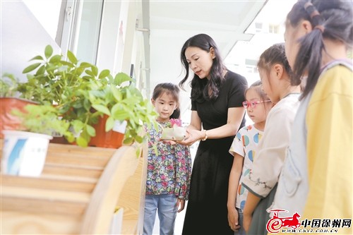 李潔老師教一年級(jí)孩子認(rèn)識(shí)植物。