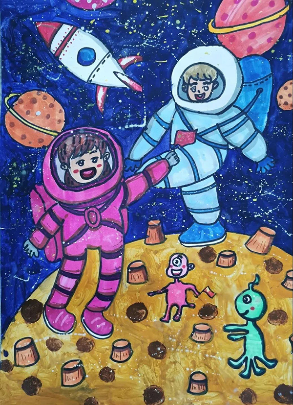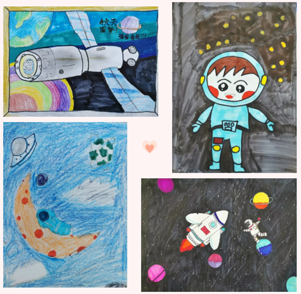 星空浩瀚無比,探索永無止境。9月17日,神舟十二號的返回艙順利著陸,聶海勝、劉伯明、湯洪波3名航天員成功回家,中國“飛天”事業(yè)又一次開啟新的篇章。城崗小學(xué)全體師生共同見證了這歷史性的一刻。在飽滿的愛國精神和民族自豪感的鼓舞下,同學(xué)們用自己的實際行動來致敬航天英雄,傳承航天精神。少先隊員們充分發(fā)揮自己的想象力,創(chuàng)作了一系列的繪畫作品。這些作品承載著同學(xué)們對科技的熱愛,對浩瀚宇宙的向往,對航天英雄的敬佩,對國家航天科技的自豪!