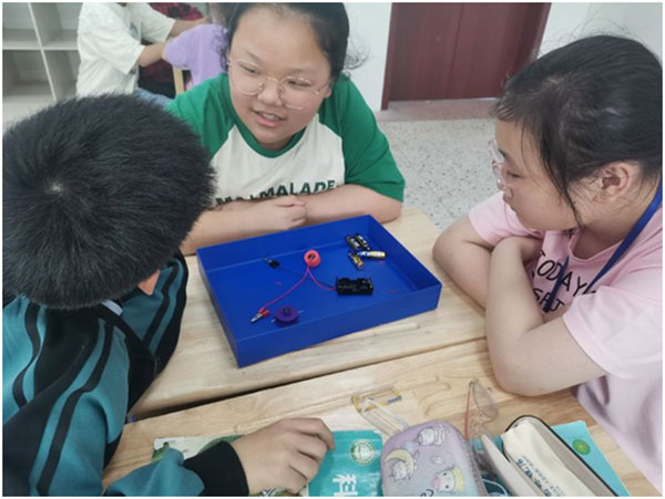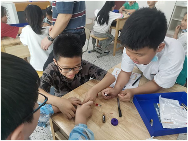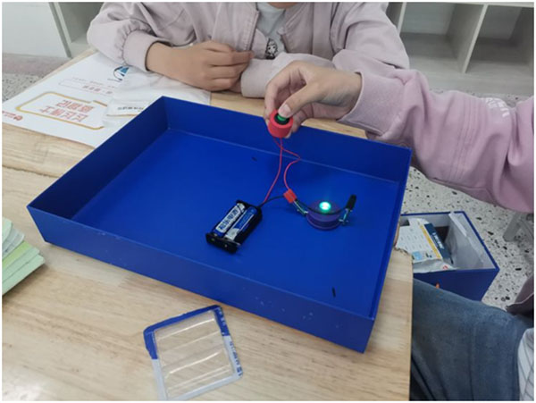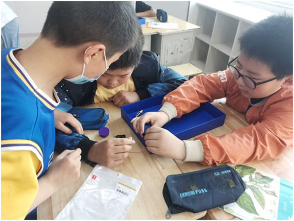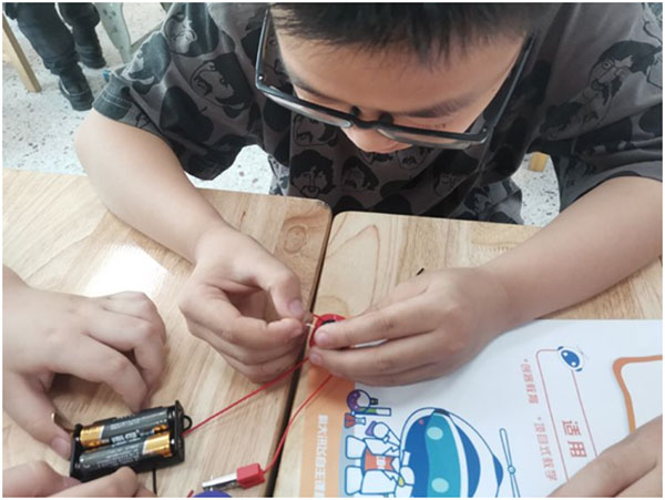 小燈泡被點(diǎn)亮這次實(shí)驗(yàn)課上,孩子們表現(xiàn)都很積極,孩子們不僅學(xué)會(huì)了簡(jiǎn)單電路的連接方法,而且還培養(yǎng)了他們之間的互動(dòng)與配合。