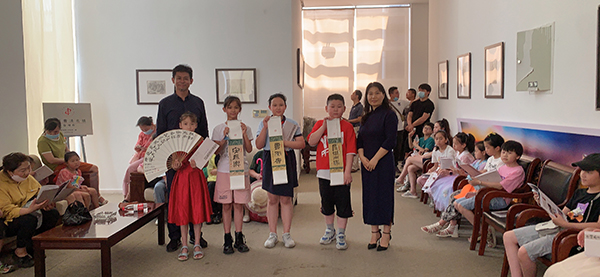 時(shí)近中午,家長與孩子們在一樓貴賓室進(jìn)行抽獎活動,隨后蔣永武老師、李文華老師現(xiàn)場書寫扇面以及教孩子們?nèi)绾卧跁ㄗ髌分锈j印等,孩子們認(rèn)真觀摩學(xué)習(xí)。