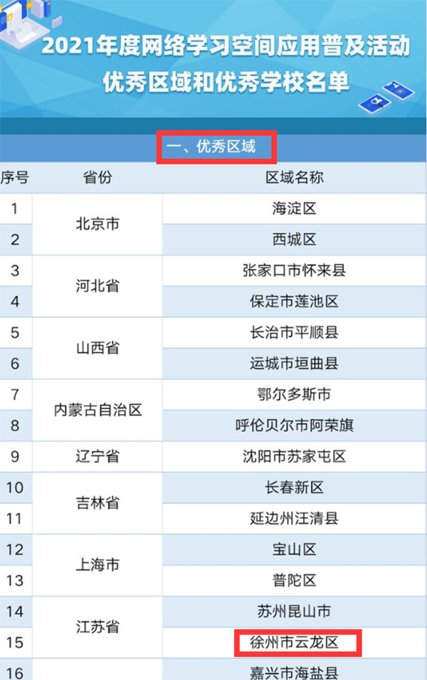 黃淮網(wǎng) 近日,教育部公布2021年度網(wǎng)絡學習空間應用普及活動優(yōu)秀區(qū)域和優(yōu)秀學校名單,徐州市云龍區(qū)、徐州市青年路小學作為徐州市唯一成功入選的優(yōu)秀區(qū)域和優(yōu)秀學校榜上有名。